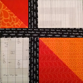 Last catch up post I promise - well at least for my bee hive block anyways. For the month of August, Michele S. (yes, there were three Micheles in a row!) was the lovely queen bee. She was super gracious to all of us swamped by summer and picked the new, fun and super easy bonus block - Checker. Oh my, what a fun block! And then she made it even more fun by asking us to pick any single saturated color of our choice for the half square triangles in the block. She also asked us to name the blocks after food - pretty sure she was hungry when she was making up a few sample blocks. hehe I also discovered that we both have very similar fabric crushes which made it all the more fun to have an excuse to pull out some of my most loved fabrics for Michele's blocks. Yes - blocks as in more than one. At one point I had fabric pulled for 6 blocks laid out on the bed, but my husband told me to calm it down a bit. I ended up making three blocks because when the block is this fun and easy, one simply isn't enough. Here is my Mango Muddle block:
